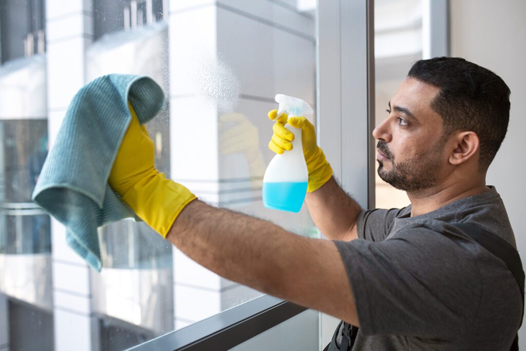 Fingerabdrücke, Streifen und Flecken an Glastüren und Trennwänden werden regelmäßig entfernt – besonders wichtig in modernen Büroflächen